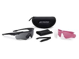 Black frames. Two fully-assembled Crossbow eyeshields: (1) w/Clear lens & (1) w/Smoke Gray lens. Small zippered hard case & microfiber cleaning pouch