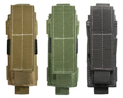 A durable single sheath can hold an extra flashlight, small cellular phone, multitool, folding knife, or handgun magazine.