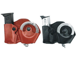 Combination handcuff case and magazine pouch features easy-on, easy-off paddle. Adjust mag pouch tension screw to your preference. Top quality leather with deep molding and polishing. The Gold Line feels right.